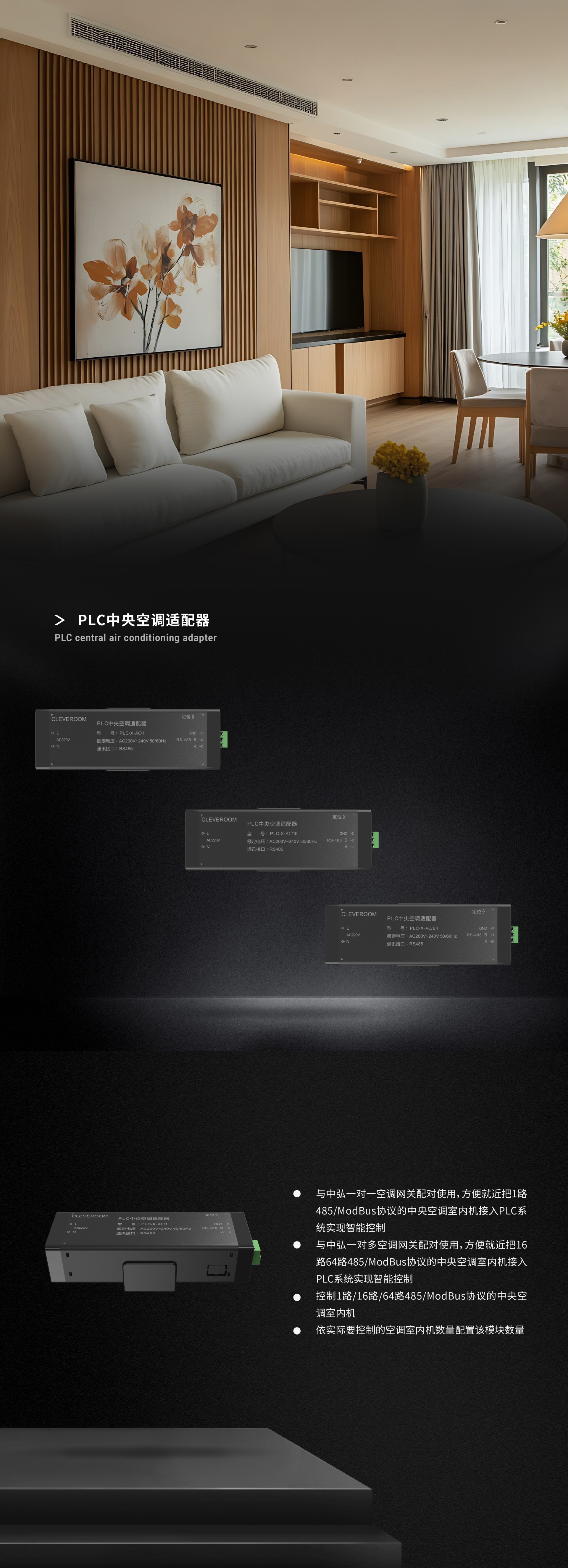 - 与中弘一对一空调网关配对使用,方便就近把1路485/ModBus协议的中央空调室内机接入PLC系统实现智能控制