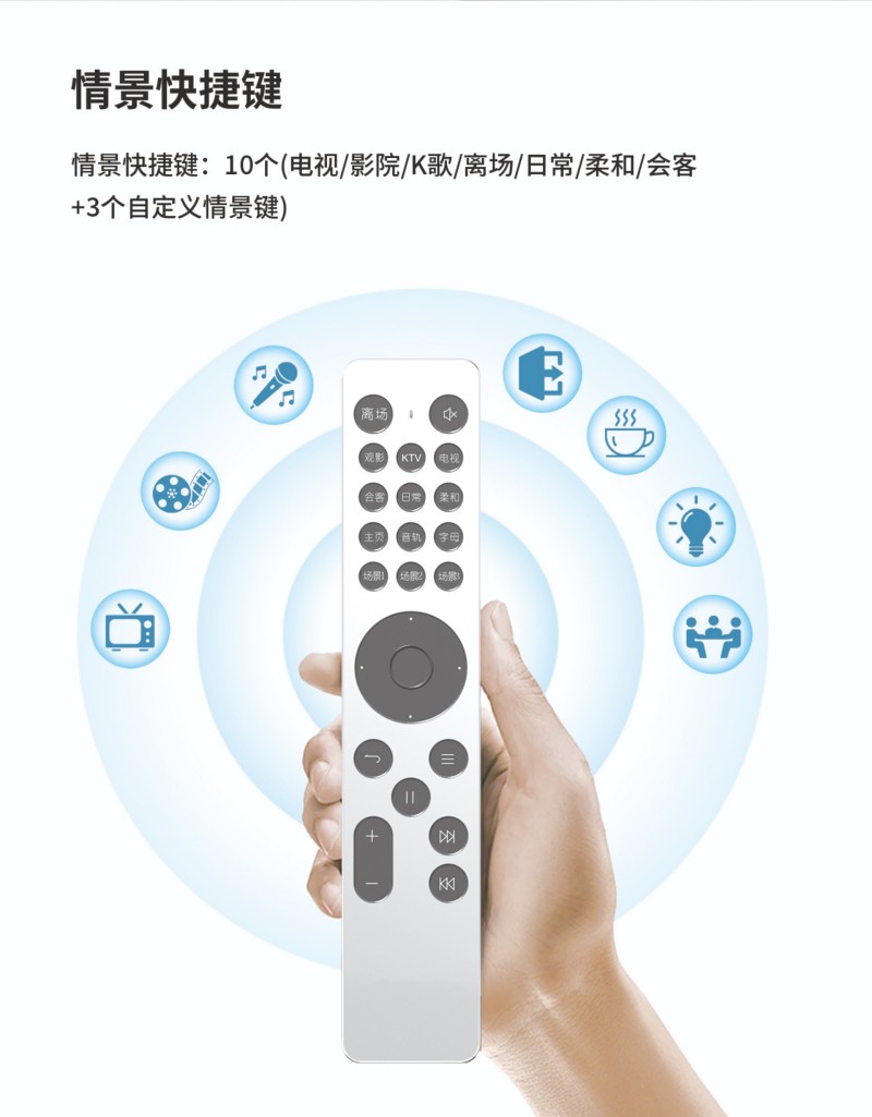 10个(电视/影院/K歌/离场/日常/柔和/会客+3个自定义情景键)