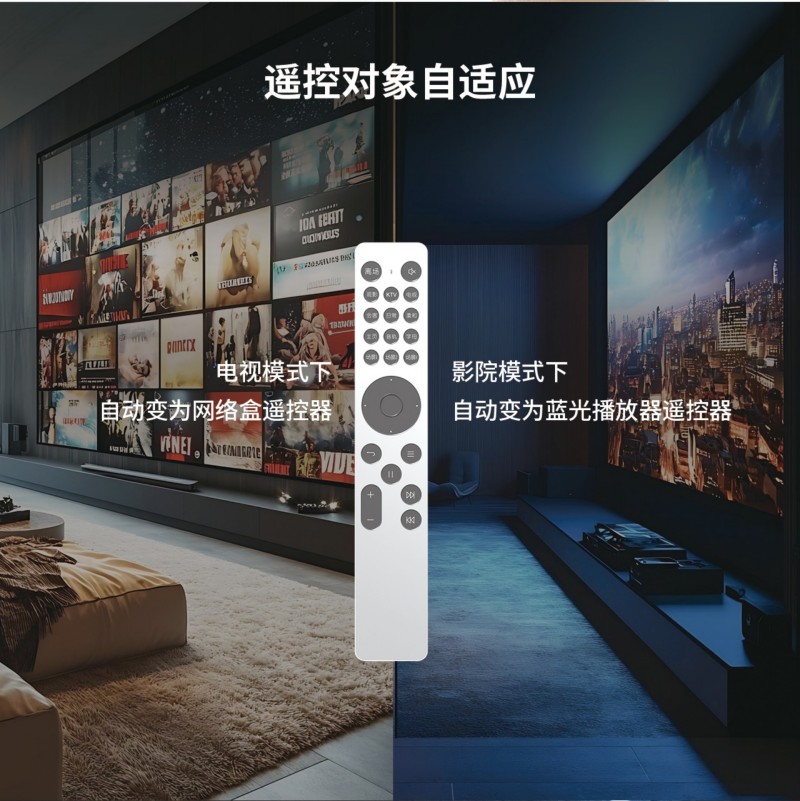 电视模式下自动变为网络盒遥控器;影院模式下自动变为蓝光播放器遥控器