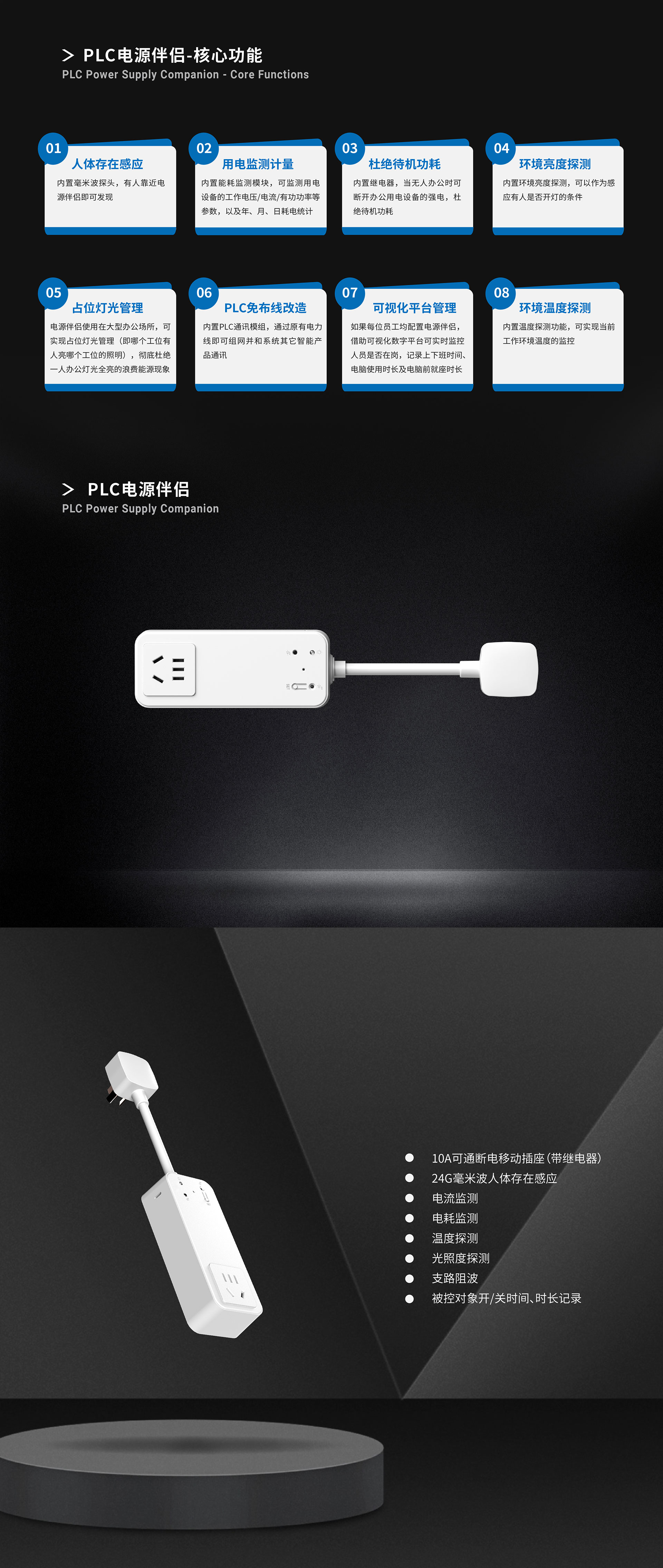 - 占位灯光管理:电源伴侣使用在大型办公场所,可实现占位灯光管理(即哪个工位有人亮哪个工位的照明),彻底杜绝一人办公灯光全亮的能源浪费现象